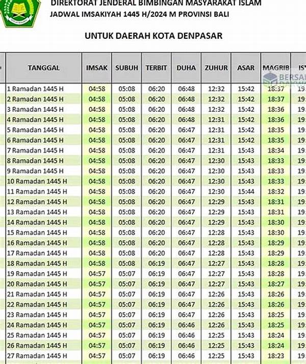 Ketika membahas tentang Denpasar, Bali, kita mungkin teringat akan keindahan pantainya, budayanya yang kaya, dan keramahan penduduknya. Namun, tahukah Anda bahwa Denpasar juga memiliki jadwal sholat yang sangat penting bagi umat Islam yang tinggal di sana? “Jadwal Sholat Denpasar WITA” adalah panduan tak ternilai bagi mereka yang ingin menjalankan ibadah dengan tepat waktu di tanah para dewata ini. Mengapa jadwal ini begitu istimewa dan bagaimana Anda bisa memanfaatkannya sebaik mungkin? Yuk, kita bahas lebih dalam.